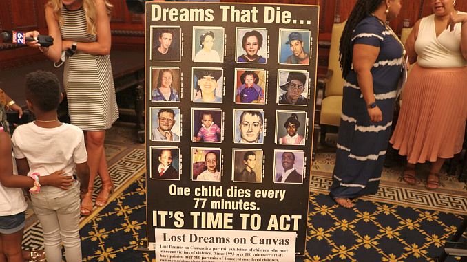 Gia đình của các nạn nhân của súng đạn tổ chức cuộc triển lãm nghệ thuật bên trong Toà Thị chính Philadelphia. Triển lãm mang tên “Những lời xin lỗi” không chỉ tôn vinh ký ức về những người đã chết vì súng, mà còn lan toả ánh sáng đến những người đang thầm lặng chịu nỗi đau mất người thân. (Ảnh: Alan Nuñez/AL DÍA News via Getty Images).