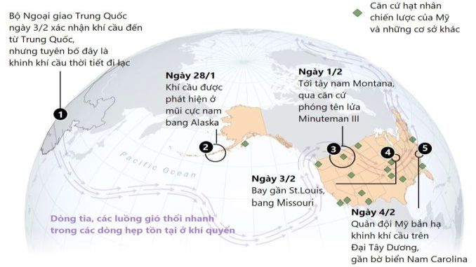Khinh khí cầu đi từ Trung Quốc qua Mỹ, bay ngang một số căn cứ chiến lược của Hoa kỳ trước khi bị bắn hạ trên Đại Tây Dương ngày 4/2. (Đồ họa: Washington Post)