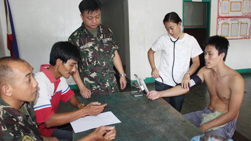 Anh Dũng (thứ hai từ trái) làm phiên dịch trong buổi khám sức khỏe cho ngư dân. (Ảnh: Đình Dân)