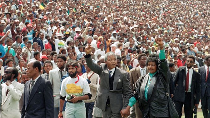 Nelson Mandela và vợ tiến vào sân vận động Soweto năm 1990, sau khi ông ra tù. (Ảnh: Udo Weitz/AP)