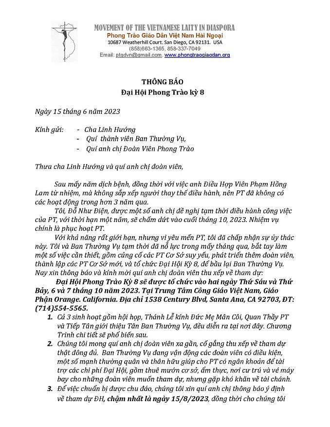 Kính chúc quí cha Linh Hướng, quí anh chị đoàn viên Phong Trào và gia quyến có một mùa hè thật hạnh phúc, và chúng ta sẽ gặp nhau trong một Đại Hội thật nhiều niềm vui và tràn đầy hy vọng trong hồng ân của Thiên Chúa.