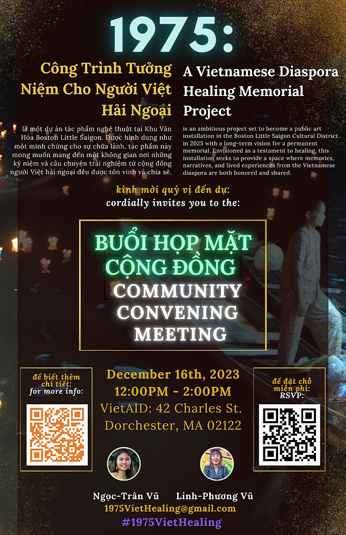 “1975: Công Trình Tưởng Niệm Cho Người Việt Hải Ngoại” là một dự án tác phẩm nghệ thuật tại Khu Văn Hóa Boston Little Saigon. Được hình dung như một minh chứng cho sự chữa lành, tác phẩm này mong muốn mang đến một không gian nơi những kỷ niệm và câu chuyện trải nghiệm từ cộng đồng người Việt hải ngoại đều được tôn vinh và chia sẻ.