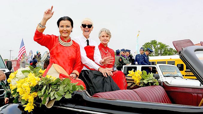 Bà Tippi Hedren (phải) cùng minh tinh Kiều Chinh (trái) và đạo diễn Jan Arnold trong chương trình diễu hành Tết tại Westminster, California năm 2016 (Ảnh: Rachel Murray/Getty Images)