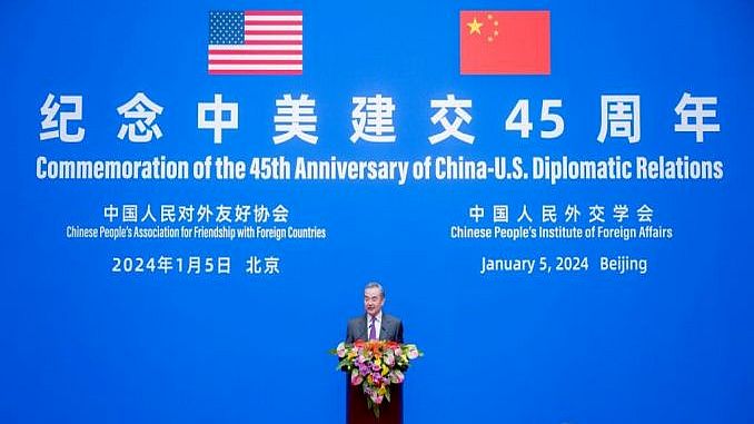 Ngoại trưởng Trung Quốc Vương Nghị tại buổi lễ kỷ niệm 45 năm thiết lập quan hệ ngoại giao Mỹ-Trung tổ chức ở Bắc Kinh ngày 5 Tháng Giêng 2024 (Zhai Jianlan/Xinhua via Getty Images)