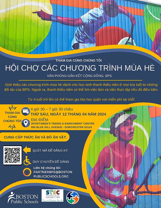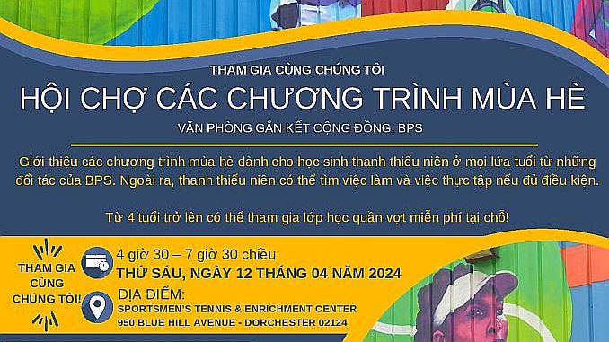 12/4/2024: Hội Chợ Các Chương Trình Mùa Hè Cho Học Sinh Trường Công Boston 04/02/2024 Hoàng Hiếu Thông Báo 0 Thời gian: Thứ Sáu, ngày 12 tháng 4 năm 2024 từ 4:30 giờ chiều – 7:30 giờ tối Địa điểm: Sportsmen’s Tennis & Enrichment Center, 950 Blue Hill Ave., Dorchester, MA 02124