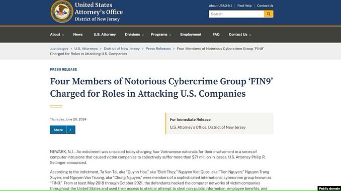 Thông cáo hôm 20/6/2024 của Bộ Tư pháp Mỹ về truy tố 4 tay tin tặc Việt Nam thuộc nhóm FIN9.