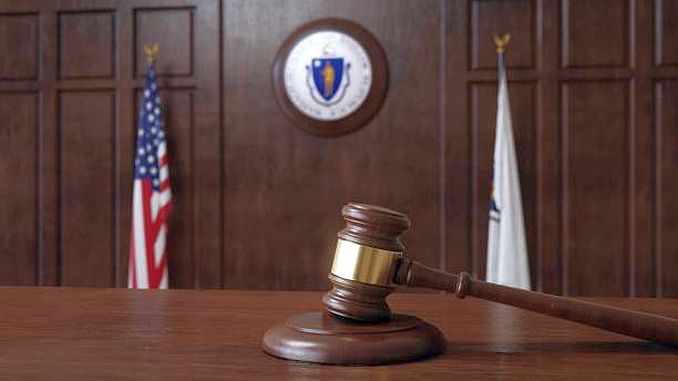 Tòa án và công lý với cờ Hoa kỳ và huy hiệu & cờ tiểu bang Massachusetts. (Hình minh họa)