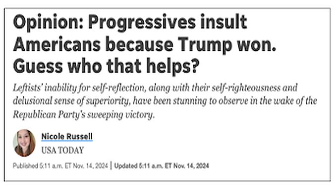 Nếu đám cấp tiến không muốn hiểu tại sao cử tri bác bỏ họ và phó TT Kamala Harris với tỷ lệ lớn, đó là thiệt thòi cho họ thôi. Cả nước sẽ bỏ họ lại phía sau, trong khi khối bảo thủ vẽ lại tương lai.