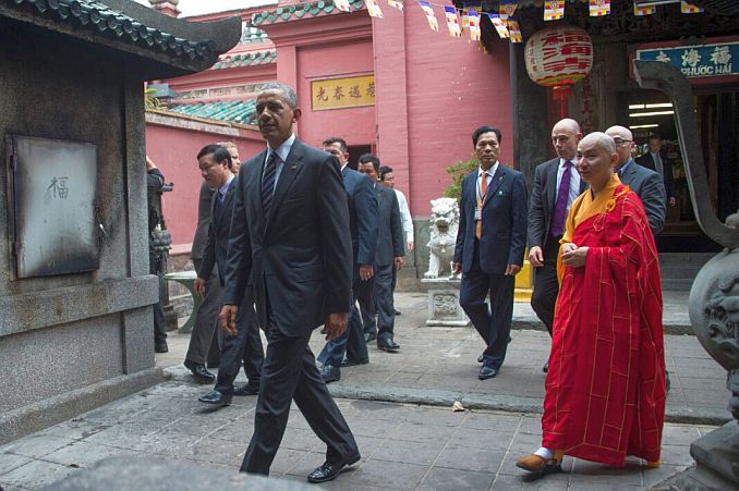 Ông Barack Obama (trái), tổng thống Mỹ, thăm chùa Ngọc Hoàng ở Sài Gòn vào ngày 24 Tháng Năm, 2016. (Hình: Jim Watson/AFP via Getty Images)