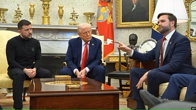 Tổng thống Hoa Kỳ Donald Trump, Tổng thống Ukraine Volodymyr Zelenskyy, Phó Tổng thống JD Vance (phải) tại Phòng Bầu dục của Nhà Trắng ở Washington, DC, ngày 28/2/2025.