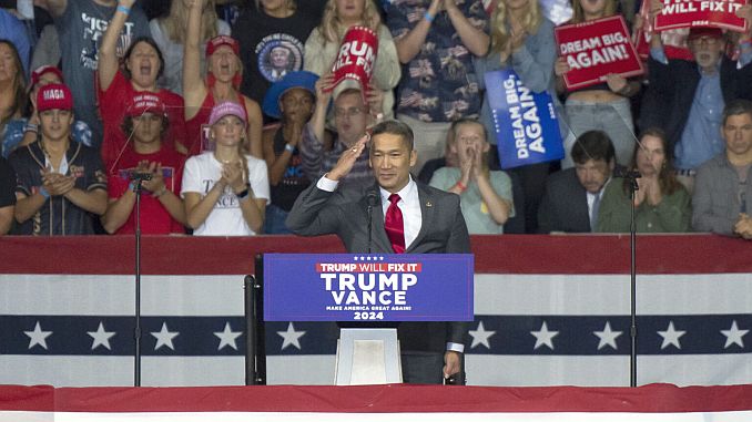 Cựu Đại Tá Hùng Cao phát biểu ủng hộ liên danh Trump-Vance tranh cử vào Tòa Bạch Ốc ở Salem, Virginia, ngày 2 Tháng Mười Một, 2024. (Hình: Allison Joyce/AFP/Getty Images)
