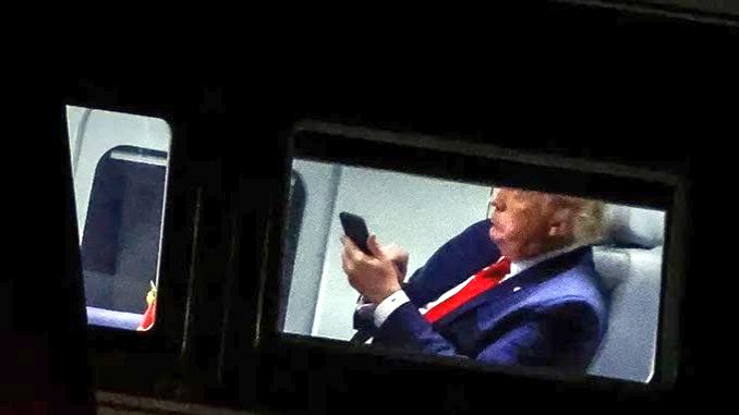 Tổng thống Hoa kỳ Donald Trump xem điện thoại tay khi trực thăng Marine One đến tòa Bạch ốc ở Washington DC vào ngày 9/8/2020. (Ảnh của Samuel Corum/Getty Images)