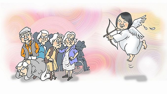 Ấy vậy mà hôm rồi trong làng già này có cụ ông 70 tuổi ngỏ lời cầu hôn với cụ bà 70. Cả hai hoan hỷ ký bản án chung thân bắt đầu từ đây. Ở tuổi này thì bản án chung thân chắc cũng không dài lâu, mà lỡ có cơm không lành canh không ngọt thì vẫn có thể xin… khoan hồng giảm án! Thì cũng chính mắt tôi chứng kiến cảnh đập vỡ tổ ấm rồi chia tay ở tuổi rất già. Ông 78 và bà kém vài tuổi tách căn nhà, bán căn nhà chung ở bên ngoài làng già rồi mỗi người vào đây mua một căn riêng, tự sống một mình. Làng già này có đến 6 nghìn căn, ai có tiền cứ vào mua một căn mà ở, việc gì phải tránh mặt nhau. Hỏi tại sao lại chia tay thế thì ông bảo: «Cứ cãi nhau tối ngày không chịu nổi!»