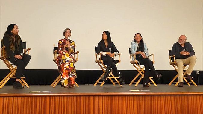 Phần trả lời phỏng vấn sau buối chiếu phim Đất Lành Chim Đậu. Từ trái: Đỗ Bảo Anh (điều hợp viên), bà Dung, giám đốc sản xuất Lan Cao, đạo diễn Naja Phạm Lockwood, phóng viên chiến trường David Hume Kennerly