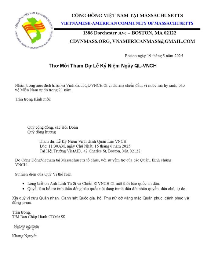 15/6/2025: Mời Tham Dự Lễ Kỷ Niệm Ngày Quân Lực VNCH 2025 Tại Boston 06/11/2025 Hoàng Hiếu Thông Báo 0