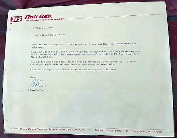 “Cám ơn anh đã cộng tác với Thời Báo qua loạt bài chuyện phiếm trong các tuần qua. Nhận thấy loạt bài này rất hay và có giá trị, chúng tôi xin mời anh viết thường trực với Thời Báo hàng tuần kể từ đầu năm 2004”.