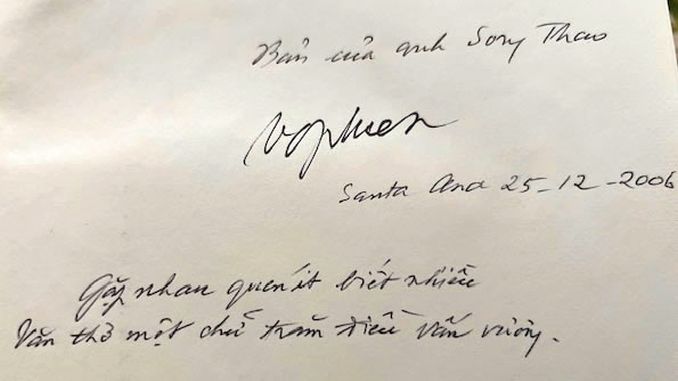 Năm 2010, tôi qua Cali vào đúng dịp tết Canh Dần, anh em rủ tới chúc tết nhà văn Võ Phiến. Ông bà đón tiếp rất thân mật, vui vẻ. Đang ngồi nói chuyện, ông nhẹ nhàng bỏ đi. Một lúc sau, ông quay lại trên tay có cuốn sách dày cộm. Đó là cuốn Tuyển Tập Võ Phiến, bìa cứng, dày tới 1080 trang. Ông khệ nệ “bưng” cuốn sách ra đưa cho tôi. Các anh em khác, dân Cali chắc đã được ông tặng rồi. Tôi còn đang cảm động tay mân mê cuốn sách quý thì ông giở trang đầu ra chỉ cho tôi. Tôi vui sướng thấy lời đề tặng và chữ ký của ông. Ông tặng tôi hai câu thơ