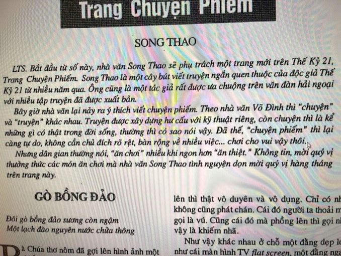“Bắt đầu từ số này, nhà văn Song Thao sẽ phụ trách một trang mới trên Thế Kỷ 21, trang Chuyện Phiếm. Song Thao là một cây bút viết truyện ngắn quen thuộc của độc giả Thế Kỷ 21 từ nhiều năm qua. Ông cũng là một tác giả rất được ưa chuộng trên văn đàn hải ngoại với nhiều tập truyện đã được xuất bản. Bây giờ nhà văn lại nảy ra ý thích viết chuyện phiếm. Theo nhà văn Võ Đình thì chuyện và truyện khác nhau. Truyện được xây dựng hư cấu với kỹ thuật riêng, còn chuyện thì là kể những gì có thật trong đời sống, thường có sao nói vậy. Đã thế, chuyện phiếm thì lại càng tự do, không cần chủ đích rõ rệt, bàn rộng về nhiều việc… chơi cho vui vậy thôi. Nhưng dân gian thường nói, ăn chơi nhiều khi ngon hơn ăn thiệt. Không tin, mời quý vị thưởng thức món ăn chơi mà nhà văn Song Thao tình nguyện dọn mời quý vị hàng tháng trên trang này”.