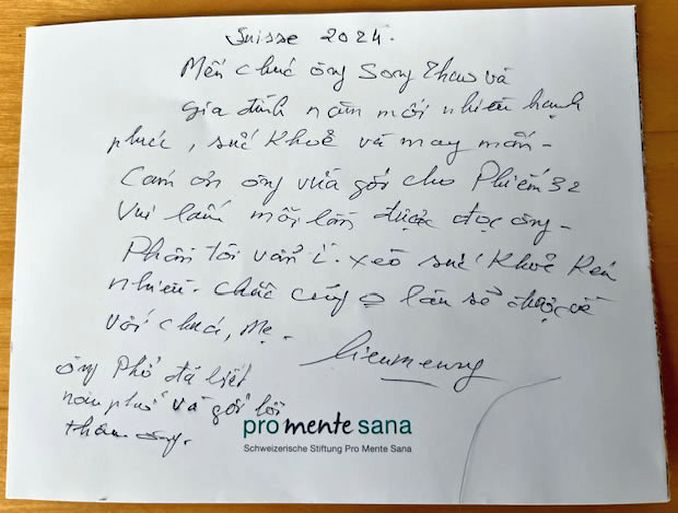 “Suisse 2024. Mến chúc ông Song Thao và gia đình năm mới nhiều hạnh phúc, sức khỏe và may mắn. Cám ơn ông vừa gửi cho Phiếm 32. Vui lắm mỗi lần được đọc ông. Phần tôi vẫn ì xèo, sức khỏe kém nhiều. Chắc cũng không lâu sẽ được về với Chúa, Mẹ”. Bà còn viết thêm bên lề: “Ông Phở đã biết nấu phở và gửi lời thăm ông”.