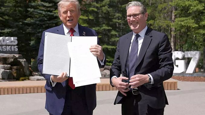Dự họp thượng đỉnh nhóm G7 ở Alberta, Canada, thủ tướng Anh Keir Starmer hôm qua, 16/06/2025, đã ký với tổng thống Hoa Kỳ Donald Trump một thỏa thuận song phương về thuế quan, khiến Luân Đôn bớt lo lắng về thương chiến trong khi kinh tế Anh đang hụt đà tăng trưởng.