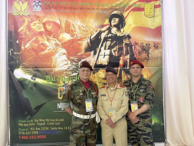 Từ trái, ông Đinh Nguyễn (Biệt Động Quân), ông Tsu A Cầu (Trung Tâm Điều Hợp Tây Nam Hoa Kỳ), và anh Đức Đoàn (Hậu Duệ Nha Kỹ Thuật VNCH). (Hình: Trà Nhiên/Người Việt)
