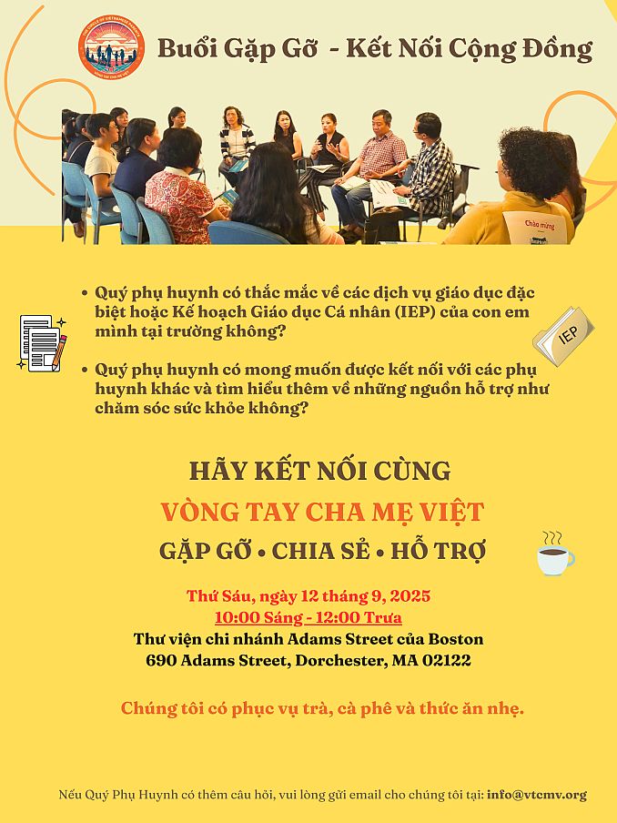 Nếu phụ huynh có bất kỳ thắc mắc nào liên quan đến kế hoạch giáo dục cá nhân (IEP/504), dịch vụ giáo dục đặc biệt, chăm sóc sức khỏe y tế tại Massachusetts, hoặc đơn giản chỉ muốn đến chào hỏi, xin mời quý vị đến