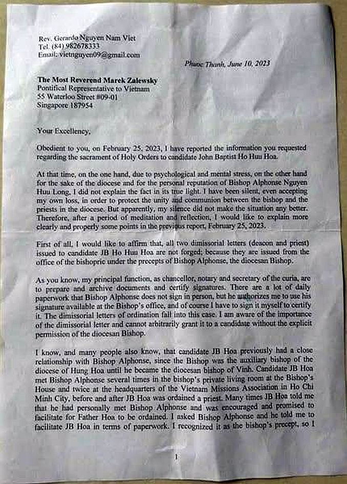 Dưới đây là bản dịch tiếng Việt đầy đủ từ lá thư của Linh mục Gerardo Nguyễn Nam Việt gửi Đức Tổng Giám mục Marek Zalewsky (Đại diện Tòa Thánh tại Việt Nam):