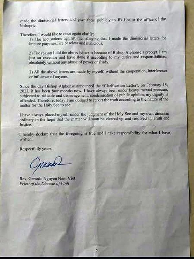 - Lý do con làm các thư trên là theo lệnh của Đức Cha Alphong; con chỉ là người thi hành và làm theo bổn phận, trách nhiệm, tuyệt đối không có lạm dụng hay mờ ám gì.