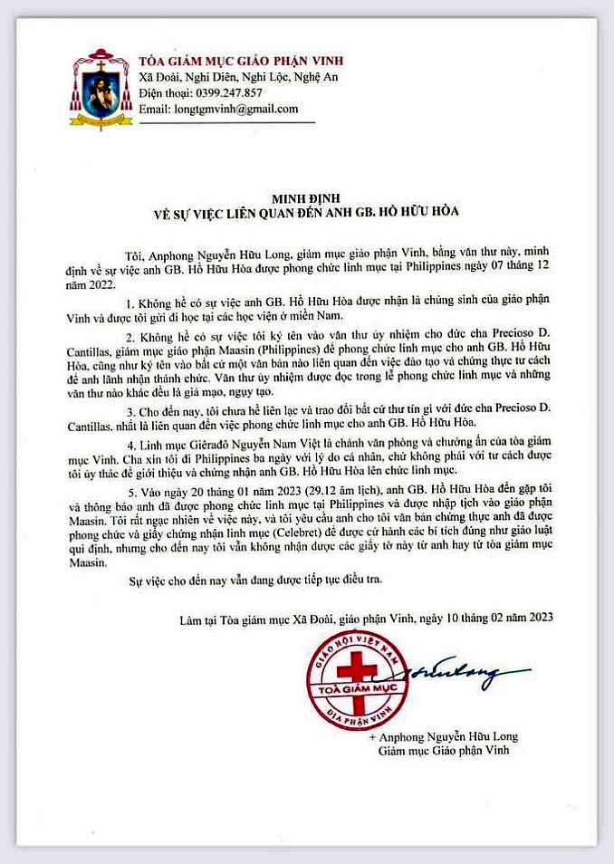 Trong mọi vụ việc, người chịu trách nhiệm cuối cùng vẫn là giám mục giáo phận. Thế nên, khi Hồ Hữu Hòa được truyền chức trong sự mờ ám, mọi ánh mắt đổ dồn về Đức cha Long. Đáng lẽ ngài phải là người giải thích minh bạch để trấn an cộng đoàn. Nhưng ngày 15/2/2023, ngài công bố một “Thư Làm Sáng Tỏ”, thay vì làm sáng tỏ, bức thư lại bị hiểu như một động thái đổ hết trách nhiệm cho cha Gerardo Nguyễn Nam Việt, lúc ấy từng là chưởng ấn phụ trách văn thư.