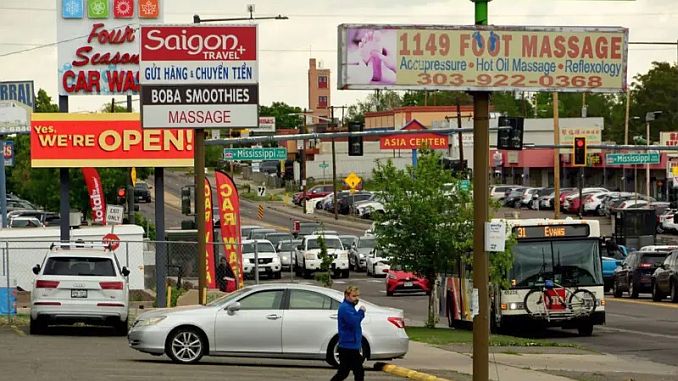 Bảng quảng cáo dịch vụ chuyển hàng và tiền của Việt kiều tại Denver, Colorado, Mỹ. (Nguồn: Getty Images)