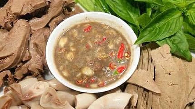 Lai rai lòng heo, sương sương trước đi. Tim, gan, phèo non, phổi, dồi trường kèm rau sống chấm mắm nêm, nhai rau ráu, chiêu một hớp rượu đế để tống tiễn lòng heo về trong bao tử của mình.