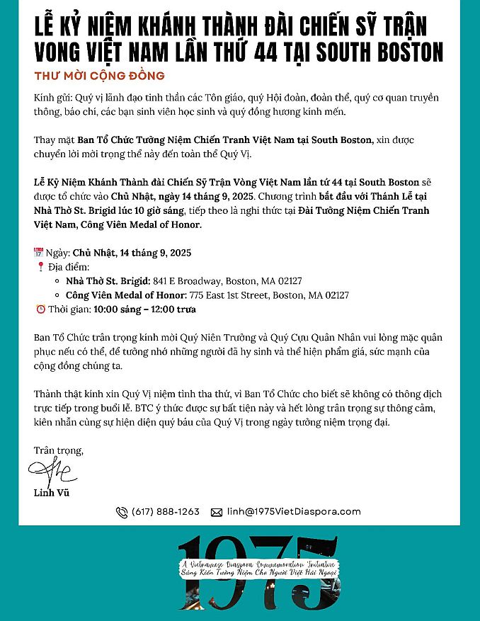 14/9/2025: Mời Tham Dự Lễ Kỷ Niệm Khánh Thành Đài Chiến Sĩ Trận Vong Việt Nam Tại South Boston 09/10/2025 Hoàng Hiếu Thông Báo 0