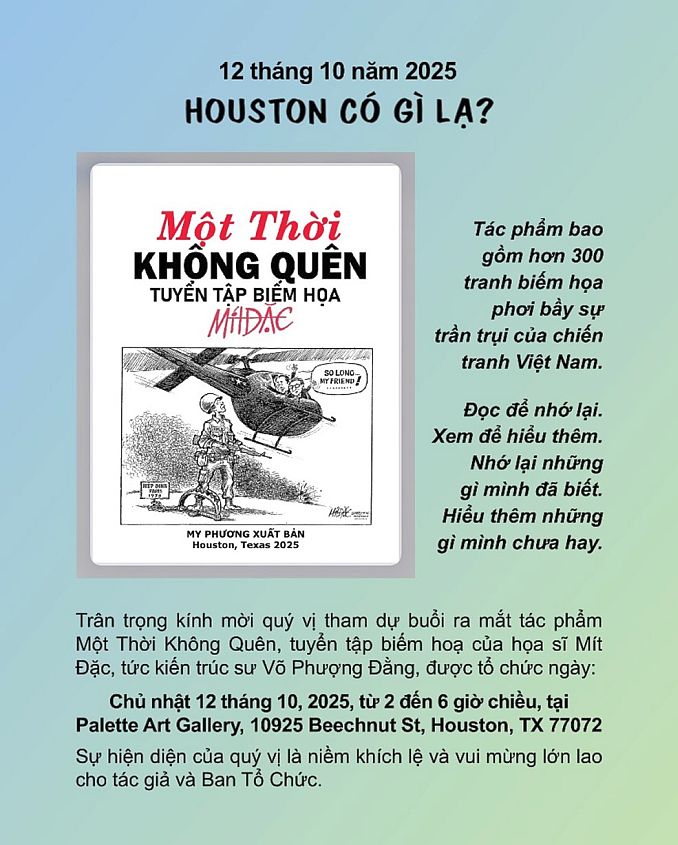 LTS: Ngày Chủ nhật 12 tháng 10 sắp đến, vào lúc 2 giờ chiều, một nhóm thân hữu của họa sĩ Mít Đặc, tức kiến trúc sư Võ Phượng Đằng, sẽ tổ chức buổi ra mắt tuyển tập biếm họa Một Thời Không Quên gần 350 trang, khổ giấy 8.5×11 inches, của ông tại Palette Art Gallery, 10925 Beechnut St, Houston, Texas. Nhằm giới thiệu tuyển tập này với độc giả, Việt Báo xin gửi đến quý vị bài Tựa của kỹ sư Nguyễn Ngọc Bảo đăng trong tuyển tập.