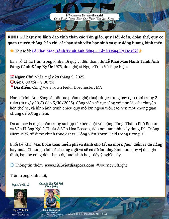 28/9/2025: Mời Tham Dự Lễ Khai Mạc Hành Trình Ánh Sáng – Cánh Đồng Ký Ức 1975 09/22/2025 Hoàng Hiếu Thông Báo 0