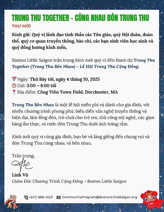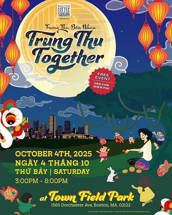 4/10/2025: Mời Tham Dự Tết Trung Thu Tại Công Viên Town Field, Fields Corner – Dorchester 09/27/2025 Hoàng Hiếu Thông Báo 0 Công viên Town Field, Fields Corner (1565 Dorchester Avenue, Dorchester, MA) Thứ Bảy, ngày 4 tháng 10, 2025 | 3 giờ chiều – 8 giờ tối Vào cửa MIỄN PHÍ