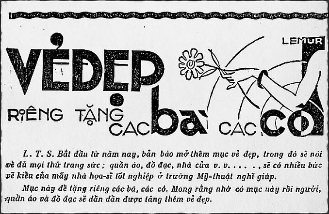 Lời tòa soạn đăng kèm trên chuyên mục “Vẻ Đẹp Riêng Tặng Các Bà Các Cô”, lần đầu ra mắt trên số 85 (Số Mùa Xuân), tuần báo Phong Hóa, ngày 11/2/1934.