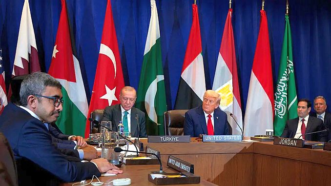 TT Hoa kỳ Donald Trump với vài lãnh đạo các quốc gia Á rập và Hồi giáo trong phiên họp thứ 80 của Đại hội đồng Liên Hiệp Quốc vào ngày 23/9/2025 tại thành phố New York. (Ảnh của Chip Somodevilla—Getty Images)