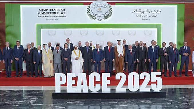 Tại Hội Nghị Thượng Đỉnh Ả Rập tại Cairo, thủ đô Ai Cập, TT Trump đã ký tên vào hòa ước Do Thái-Palestine cùng với lãnh đạo Do Thái và Hamas. TT Ai Cập, TT Thổ Nhĩ Kỳ và Quốc Vương Qatar cũng đã ký với tư cách nhân chứng bảo đảm. Ngoài ra, nhiều quốc trưởng khác cũng đã hiện diện trong buổi lễ ký hòa ước, trong đó có TT Pháp Macron, thủ tướng Anh Starmer, thủ tướng Ý Meloni, thủ tướng Canada Carney, TT Palestine, và nhiều vị khác. Tổng cộng đã có quốc trưởng, thủ tướng, hay đại diện cao cấp của 28 quốc gia tham dự.