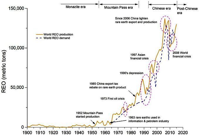Hiện Trung Quốc chiếm 80% sản lượng REE toàn cầu nhờ hệ thống chiết tách liên tục để tăng sản lượng. Chính sách môi trường thì lỏng lẻo, đồng thời xử lý chất thải rẻ (chôn lấp, hồ chứa).