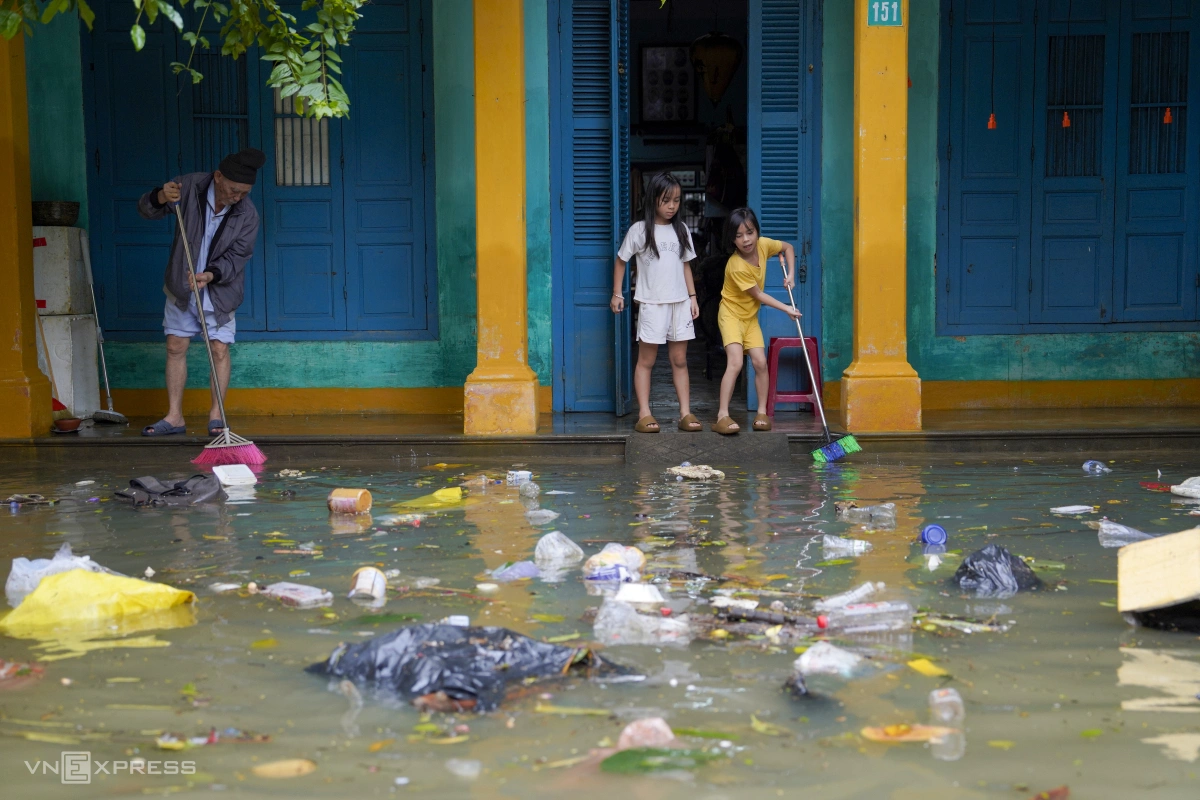Người dân Hội An chưa dọn lũ xong, lại tiếp tục đón trận lũ mới. Những túi rác được dọn tạm ra bên ngoài đường, chưa được thu gom, lại nổi lềnh bềnh khắp khu phố cổ. Nhiều người dân phải canh con nước để đẩy rác tránh trôi vào nhà.