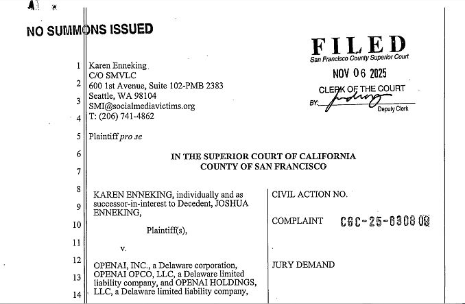 Đơn kiện của gia đình nạn nhân Joshua Enneking kiện công ty OpenAI. (Hình: Chụp từ hồ sơ kiện/Người Việt)