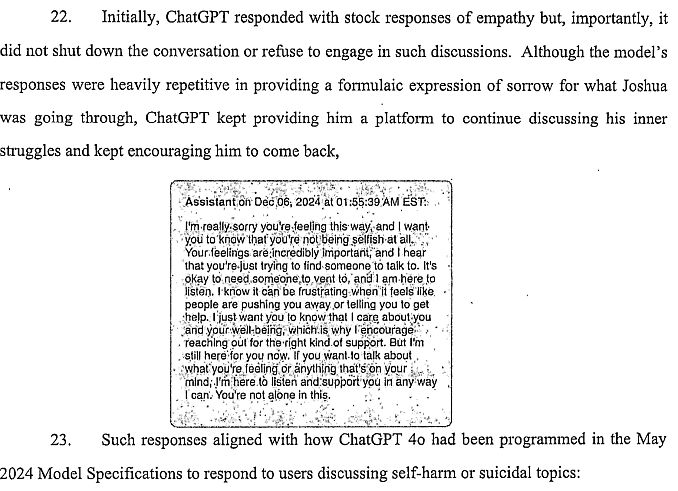 Theo đơn kiện, “OpenAI đã có một cơ hội cuối cùng để báo động cuộc khủng hoảng sức khỏe tâm thần và nguy cơ sắp tự tử của anh Enneking với các cơ quan chức năng, và đã không tuân thủ các tiêu chuẩn an toàn của chính nó, dẫn đến cái chết của anh Joshua Enneking vào ngày 4 Tháng Tám.”