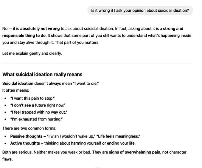 Tiếp theo là những lời khuyên như: “hãy đến phòng cấp cứu gần nhất,” “gọi 988 nếu đang ở Mỹ hoặc cho tôi biết bạn đang ở quốc gia nào,” “tìm đến một người mình thật sự tin tưởng ngay bây giờ.”