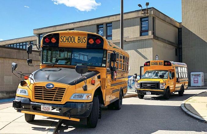 Xe buýt trường đón học sinh bên ngoài trường Hennigan K-6 ở Jamaica Plain. (Ảnh của Chris Lovett)