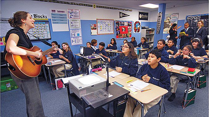 Một lớp tại Học viện Excel ở East Boston, trong dịp Thống đốc Deval Patrick viếng thăm năm 2009 (đứng giữa những người quan sát ở phía sau). (Ảnh của Chris Lovett)