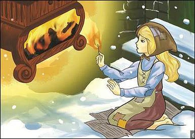 Bây giờ thì đôi bàn tay nhỏ bé của cô gần như tê cóng vì lạnh. Ừ nhỉ, cô bé tự nhủ, một chiếc que diêm có thể cho cô ta một chút hơi ấm cho những ngón tay tê cóng, nếu cô ta dám làm điều ấy. Và cô bé làm thật, lấy ra một que diêm quẹt vào vách tường. “Xoẹt” chiếc que diêm cháy bùng lên, hơi ấm toả ra, với ánh sáng lấp lánh như một ngọn nến, và cô bé hơ tay trên hơi ấm của ngọn lửa nhỏ bé đó. Đối với cô bé, giống như đang được ngồi trước một lò sưởi bằng sắt có chân bằng đồng bóng loáng, với những vật trang trí bằng đồng ở bên trên. Ánh lửa của que diêm không những mang đến cho cô bé hơi ấm, mà còn cả những hình ảnh tuyệt vời. Cô bé duỗi chân ra để sưởi ấm cho chúng, thế nhưng ngọn lửa nhỏ bé của chiếc que diêm đã vụt tắt, chiếc lò sưởi biến mất, trên tay cô bé chỉ còn lại chiếc que diêm đã tàn.