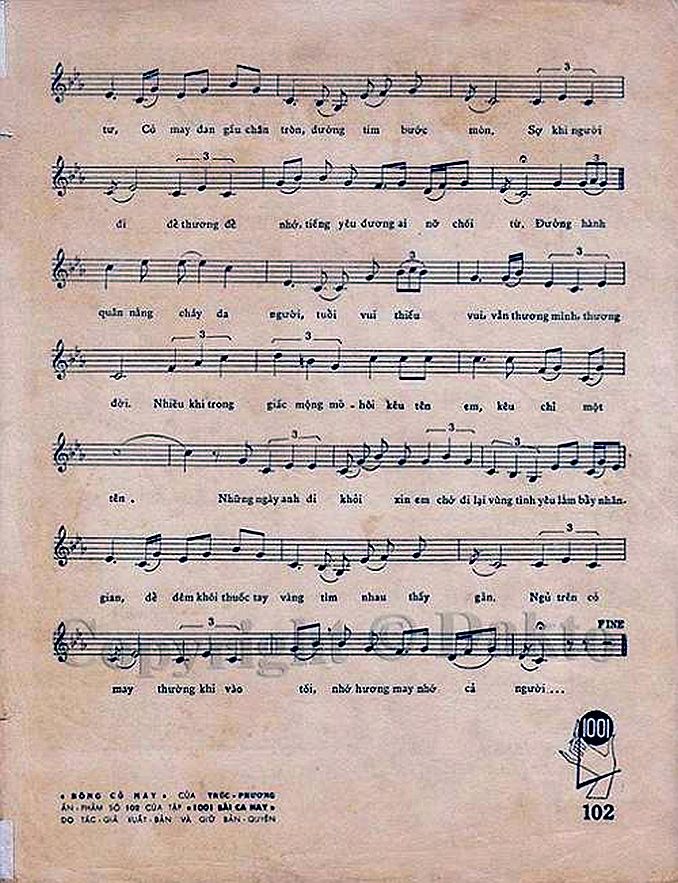 Tóc mây thơm mùi cỏ, / Đưa anh thoát xa dần vùng trần gian, / với những ưu tư, / Cỏ may đan dấu chân tròn, / Đường đi bước mòn, /Sợ khi người đi để thương, để nhớ /Tiếng yêu đương ai nỡ chối từ.”