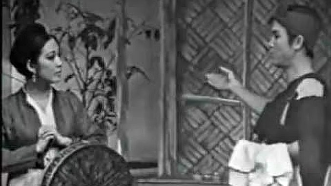 Nghệ sĩ Thanh Nga (vai Quỳnh Nga) và nghệ sĩ Thanh Sang (vai Trần Minh) trong vở cải lương kinh điển Bên cầu dệt lụa. (Nguồn ảnh: Báo Phụ Nữ TP.HCM)
