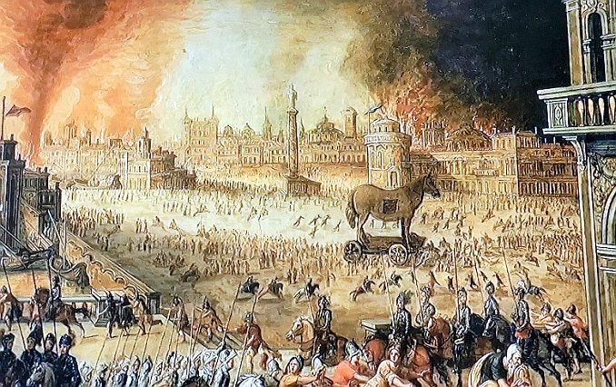 Cảnh tượng tang thương của thành Troie khi đội quân Hy Lạp trốn trong con ngựa thoát ra ngoài và mở cửa thành cho đồng đội vào đánh giết