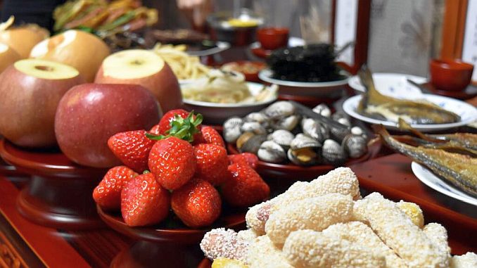 Charye (차례), lễ cúng tổ tiên, thường được tổ chức ngày mùng một Tết cổ truyền (Seollah), tại các gia đình Hàn Quốc. (Ảnh chụp năm 2015. © Wikimedia)
